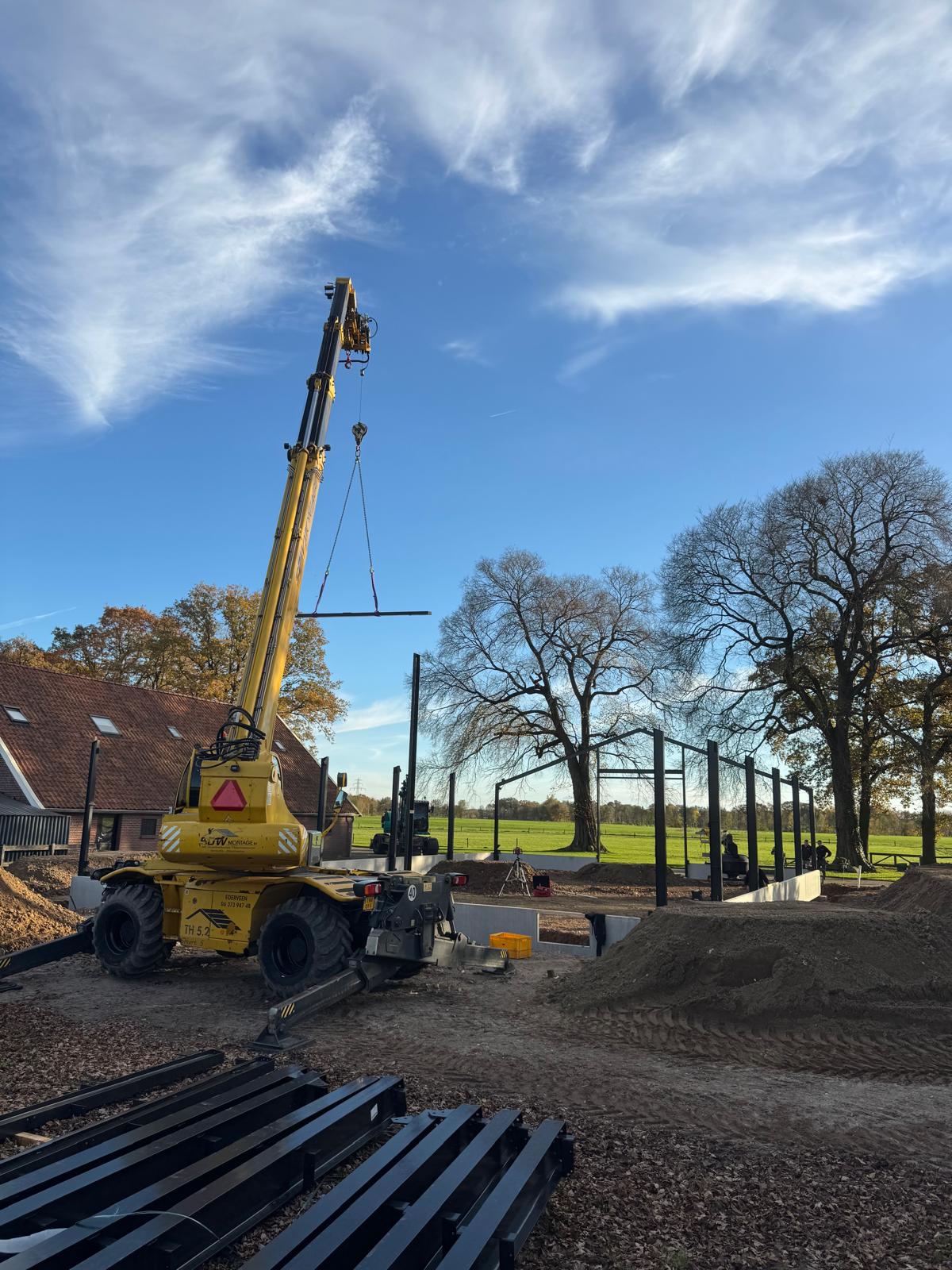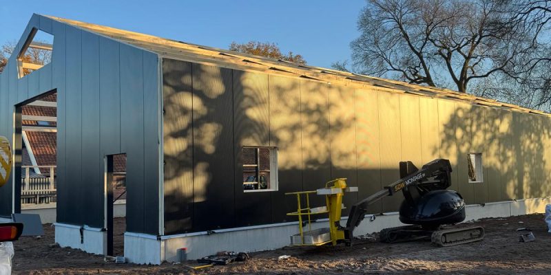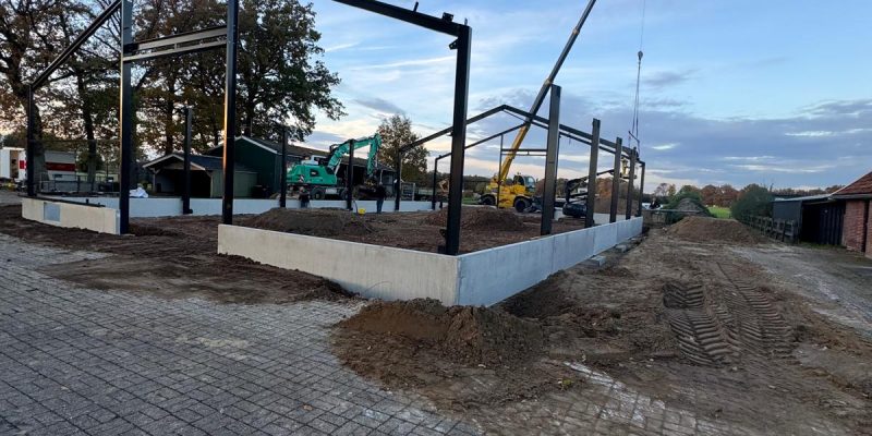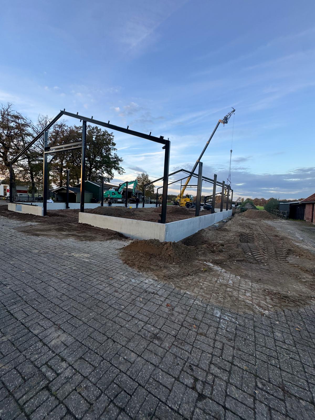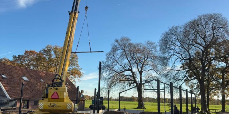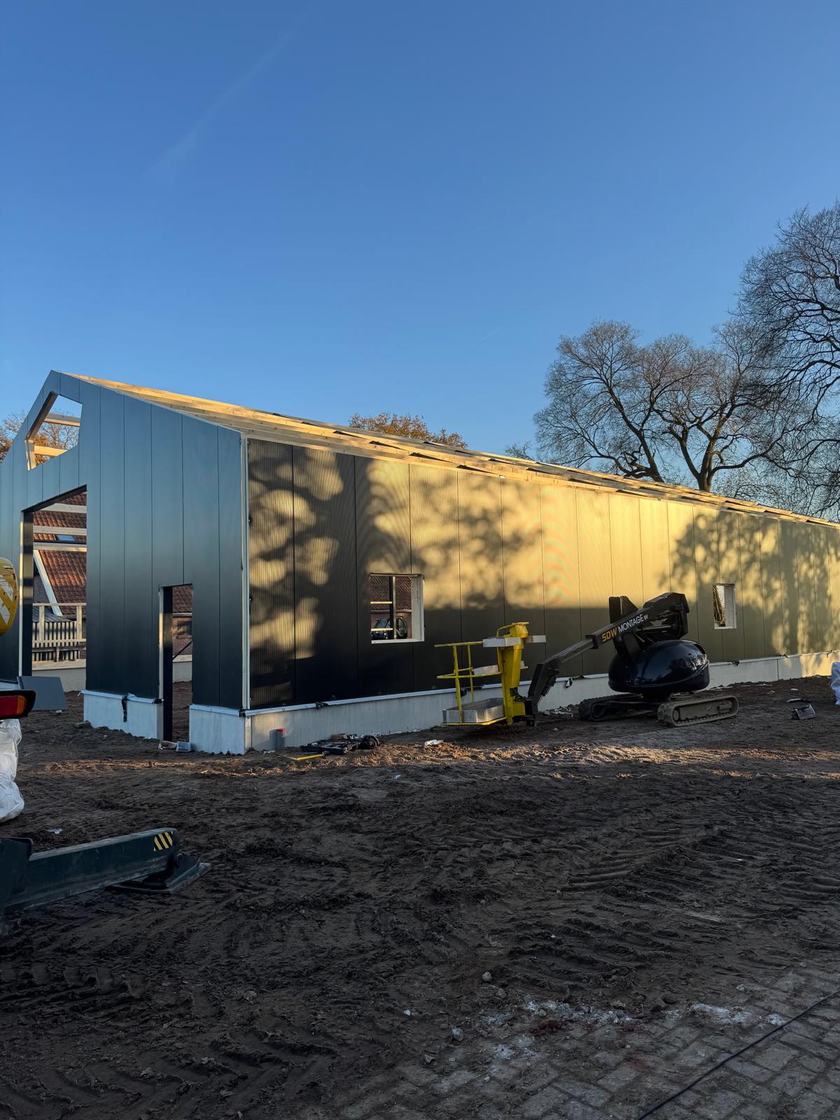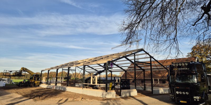Nieuwbouw bedrijfshal Ambt Delden Poeren, staalconstructie, dak- en wandbeplating aan het monteren. Hierna werken we alles af met zetwerk en kunnen we de kozijnen plaatsen.